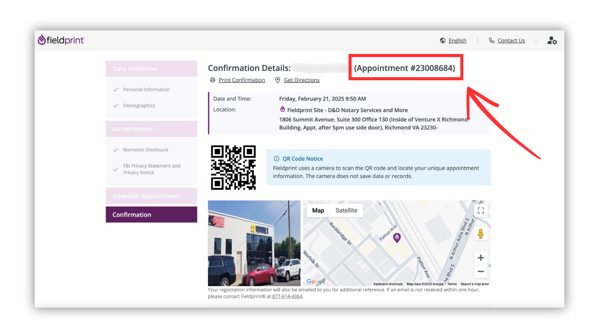 You’ll need to show this number when you arrive at your appointment. It can be found on the confirmation page and will be emailed to you by Fieldprint.