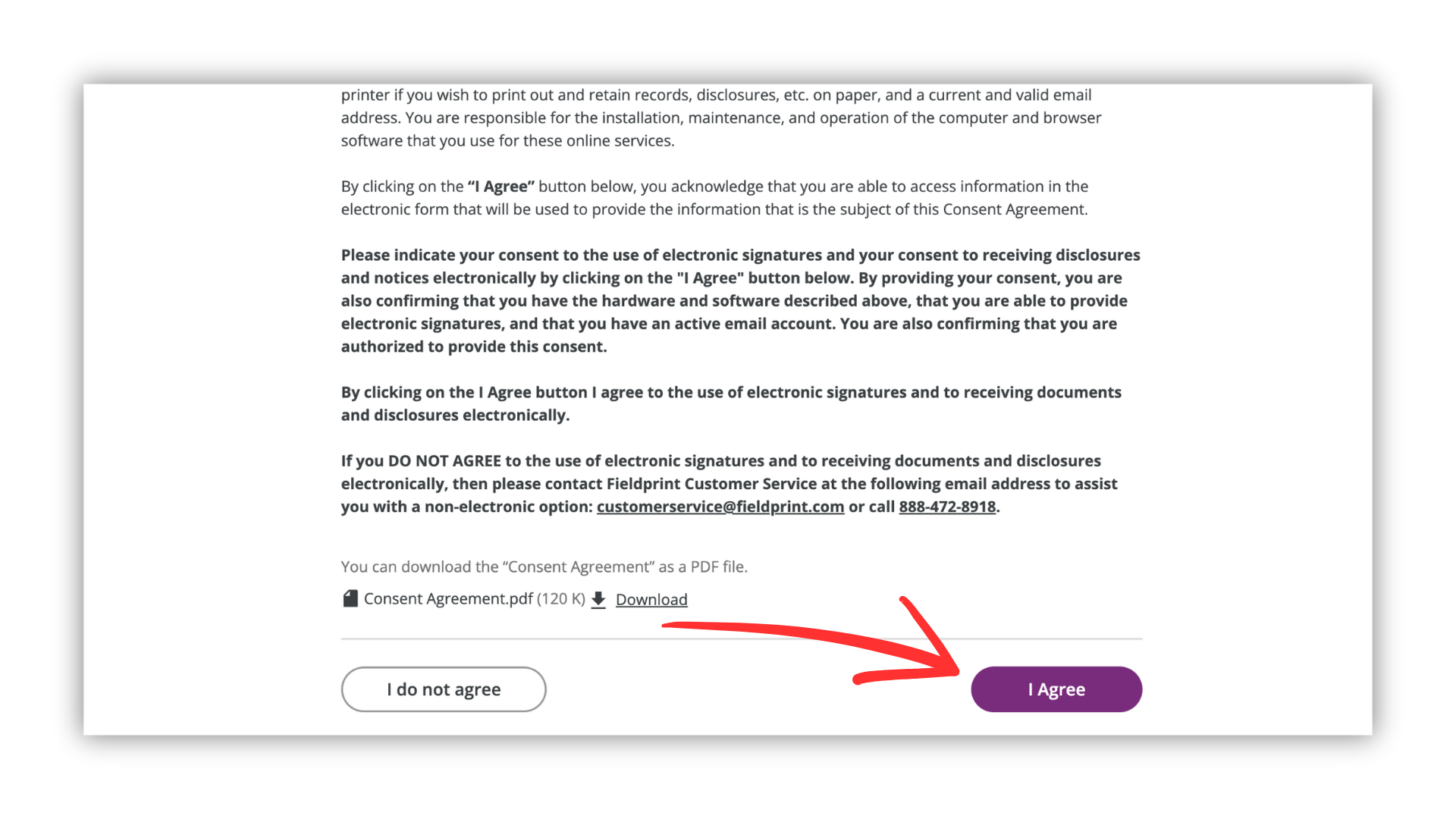 2.  Scroll down and click I Agree to the E-SIGN Act Disclosure and Consent (“Consent Agreement”).