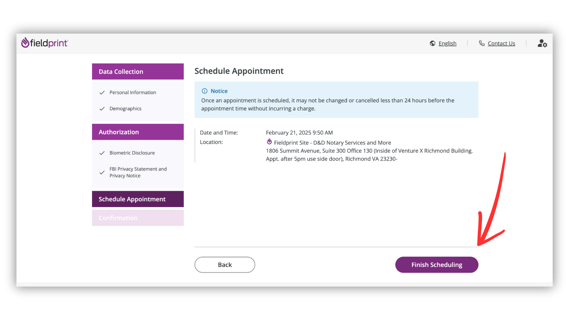 10.  Review your appointment date and time, then click Finish Scheduling to schedule your appointment.