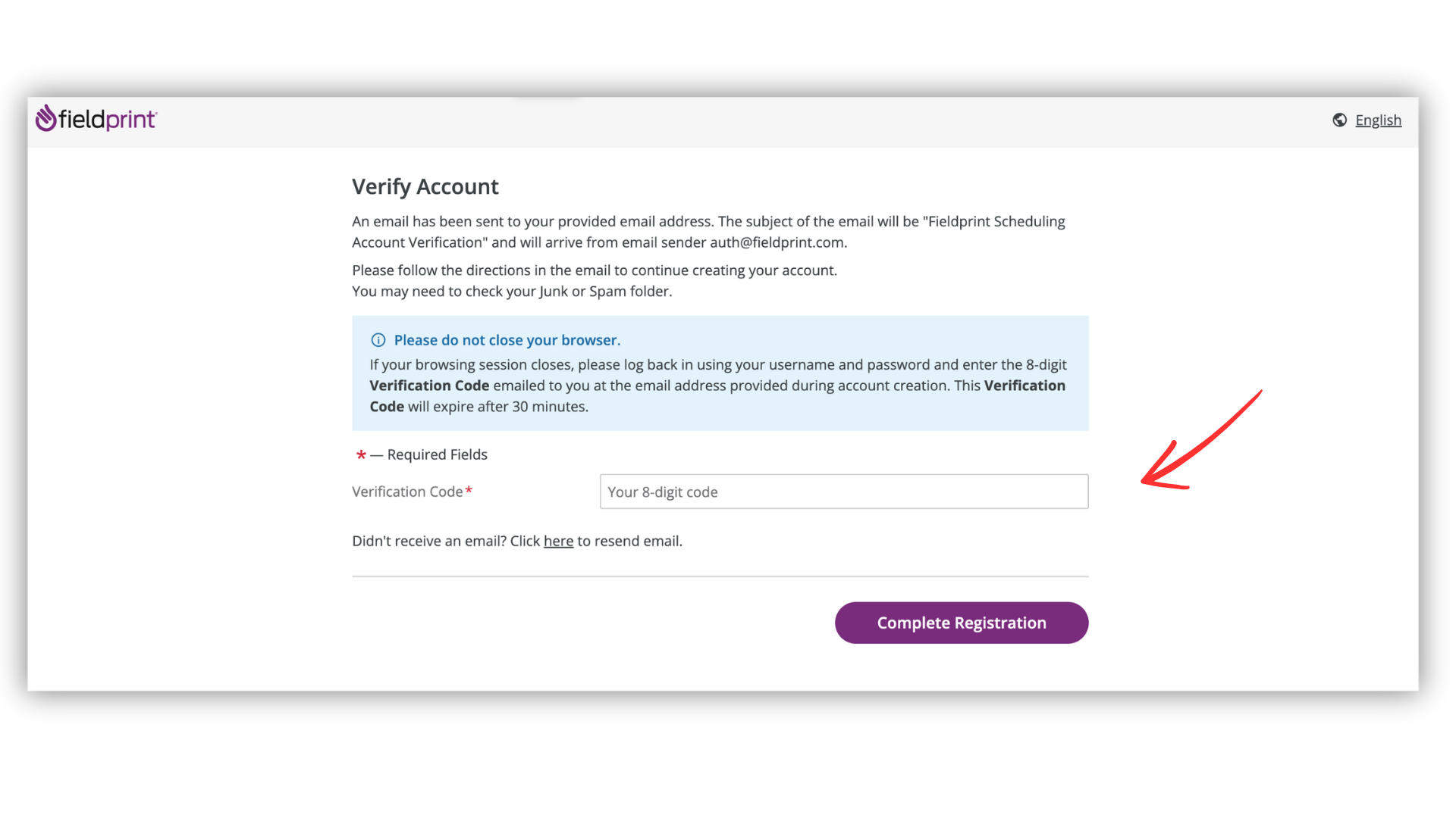 IMPORTANT: You must enter the code FPArlingtonCountyDES exactly as it appears, using the same large and small letters. Instead of typing, you may copy the code and paste it into the Fieldprint form shown.