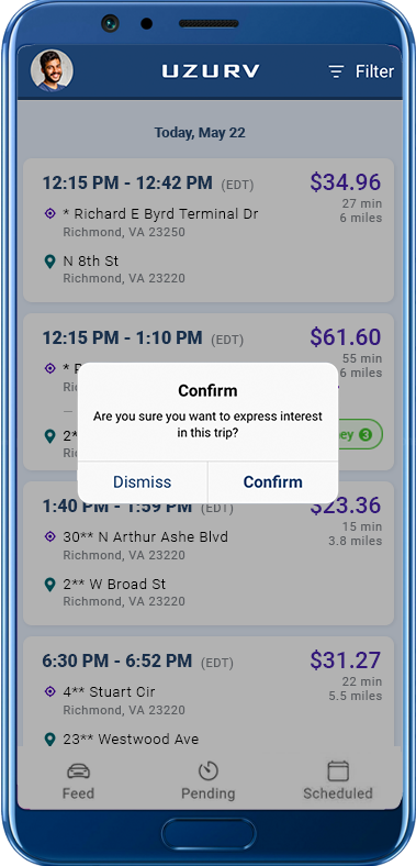 However, expressing interest in a ride does not guarantee you will be selected for that ride. More than one driver in your area may also express interest in the same ride or Journey – and only one driver can be paired with the ride.