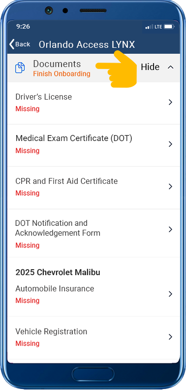 In the Drive app, navigate to the Documents tab for your transit program. Here’s what you’ll see. Tap on each document to upload it to the app.