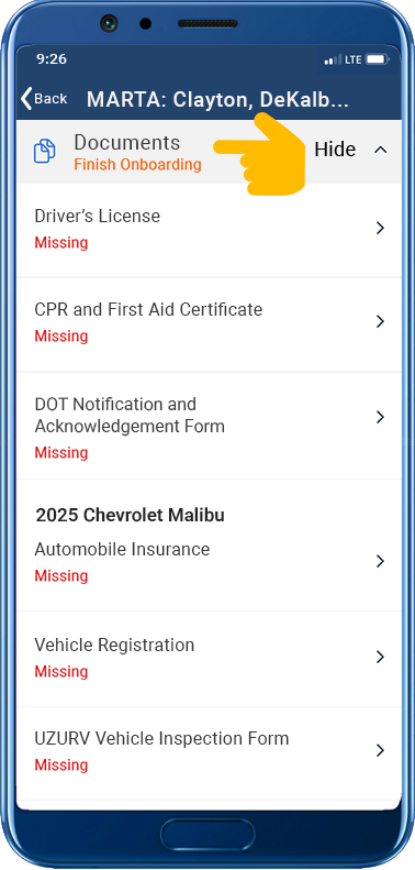 In the Drive app, navigate to the Documents tab for your transit program. Here’s what you’ll see. Tap on each document to upload it to the app.