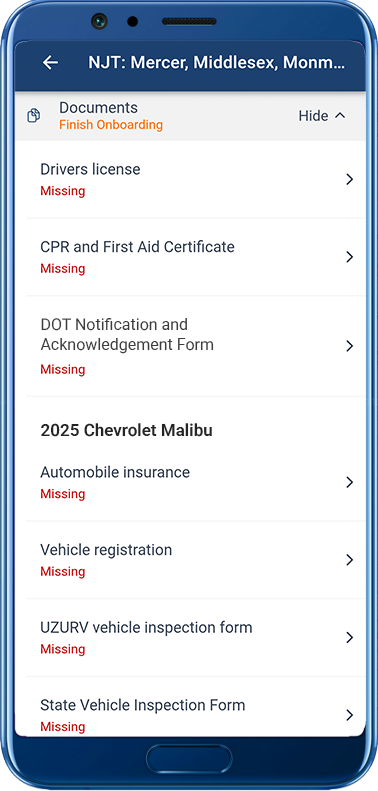 In the Drive app, navigate to the Documents tab for your transit program. Here’s what you’ll see. Tap on each document to upload it to the app.