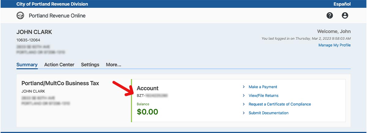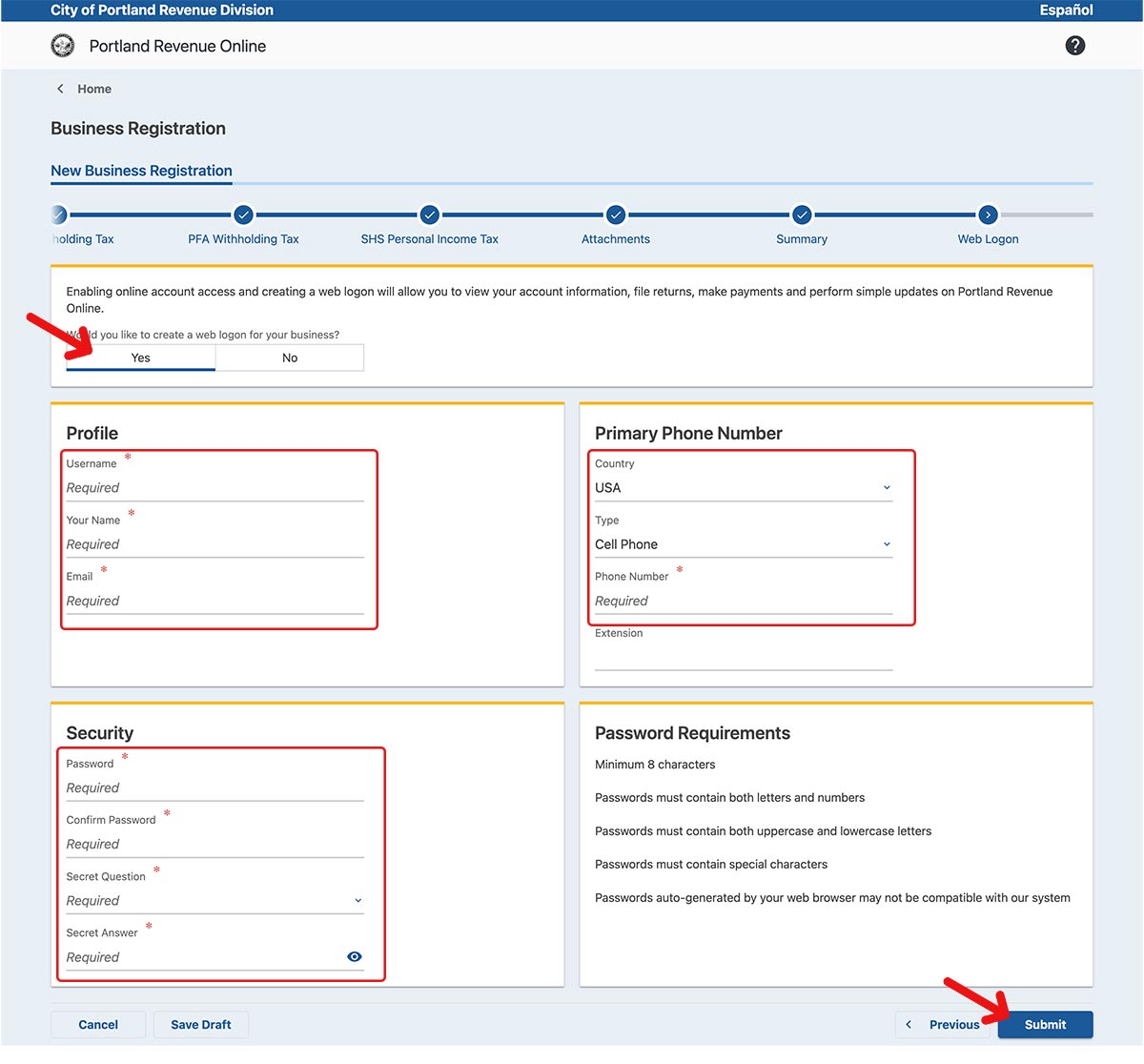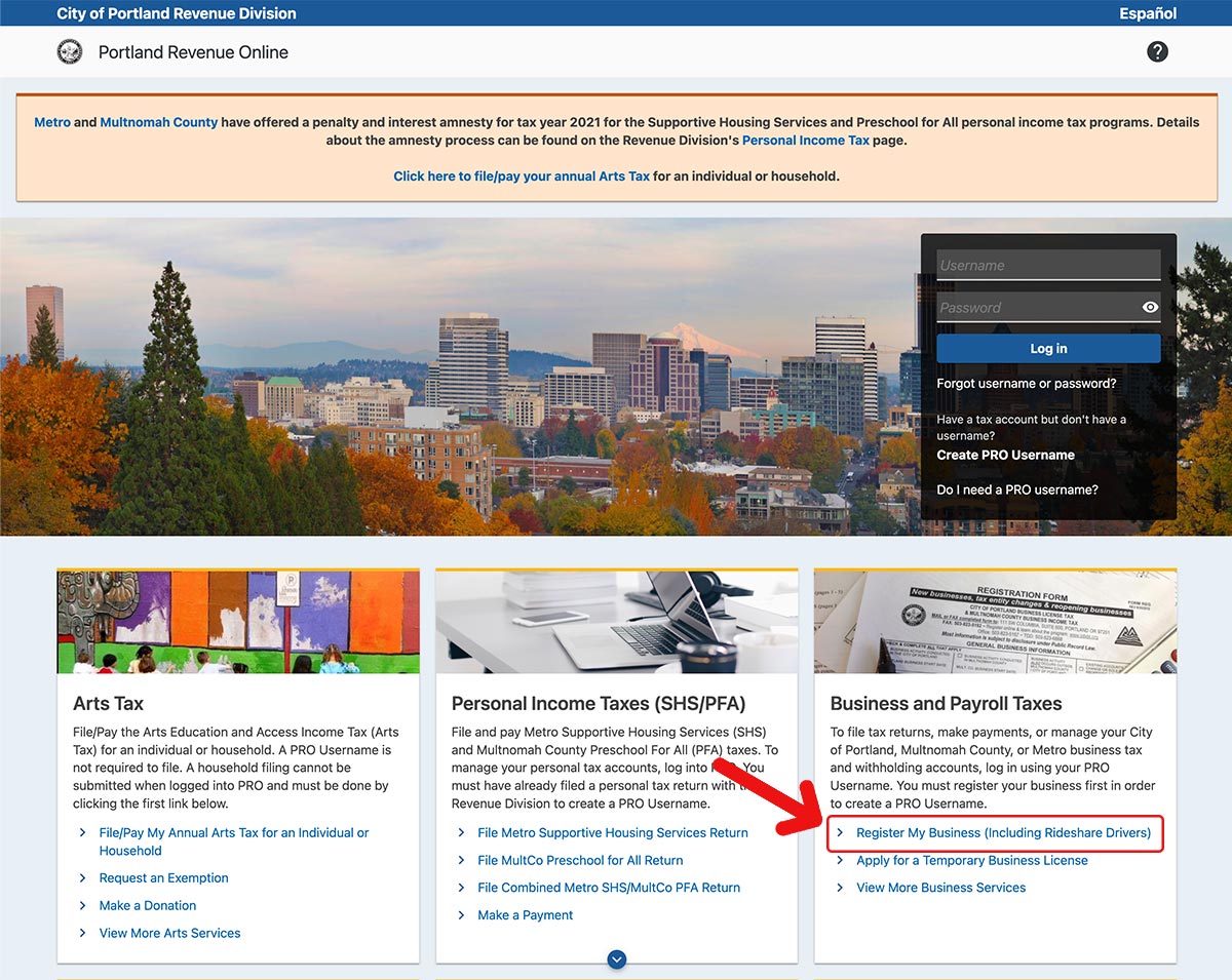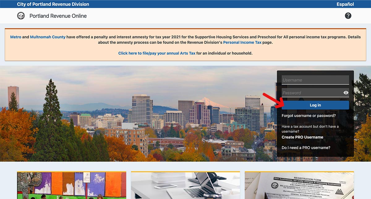 Login to the Portland Revenue Division website using the Username and Password you created.