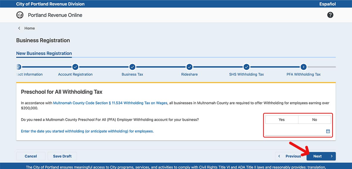 • For ‘Business Activity is conducted in Multnomah County’, click ‘YES’ and enter today’s date for Business Start