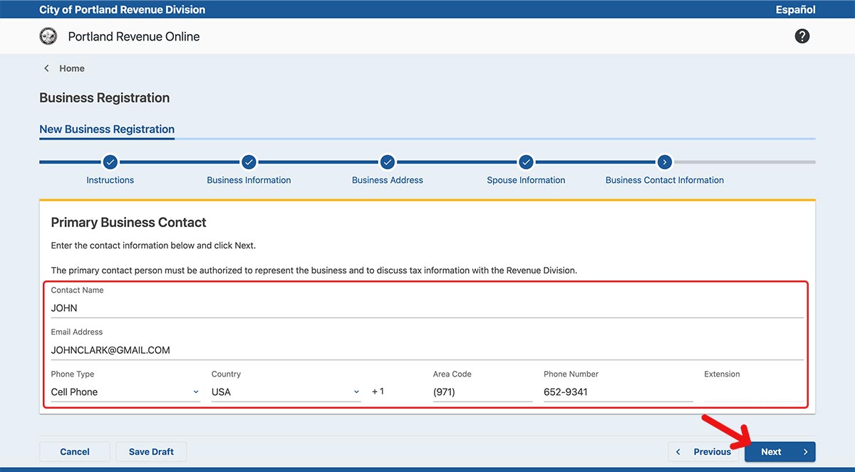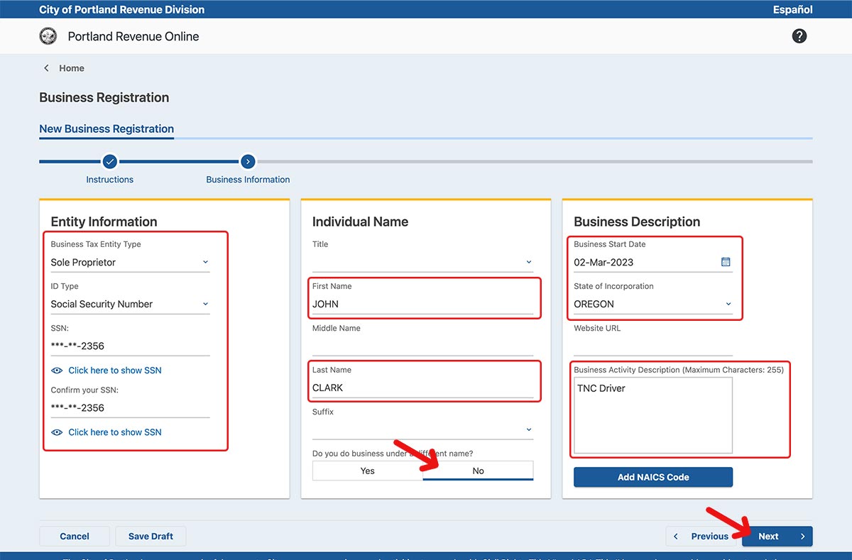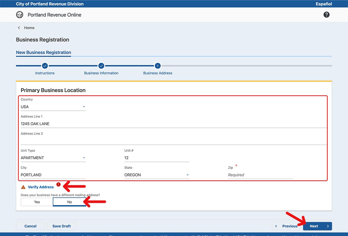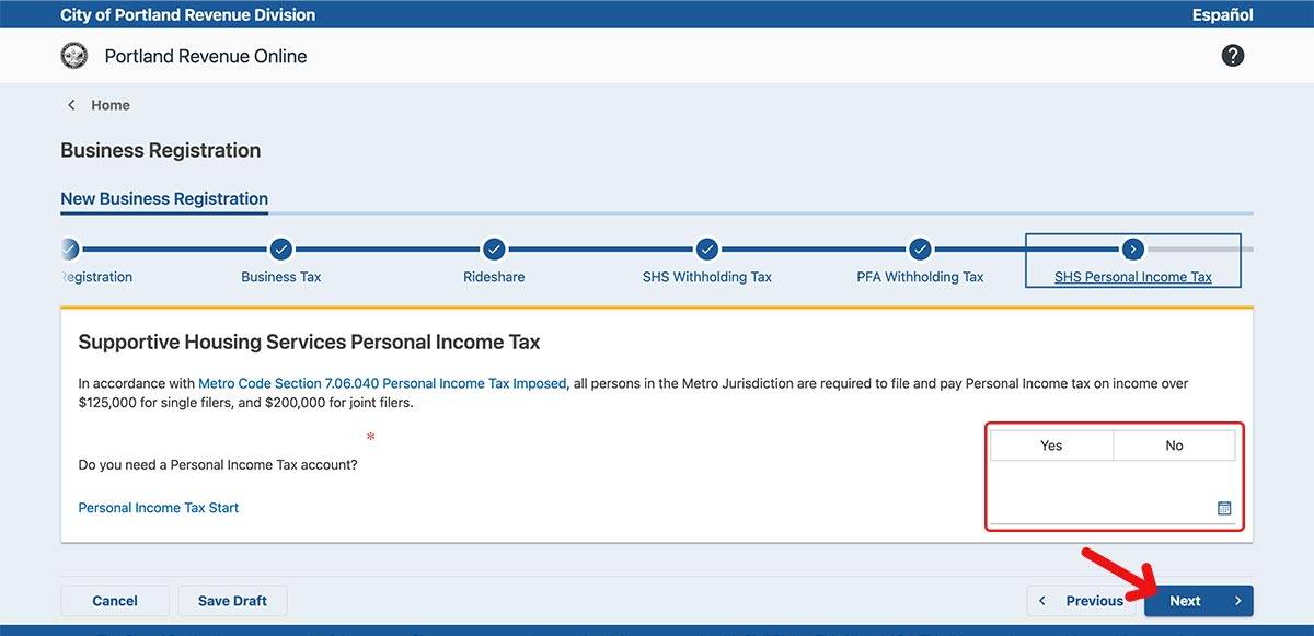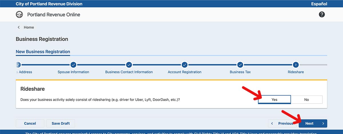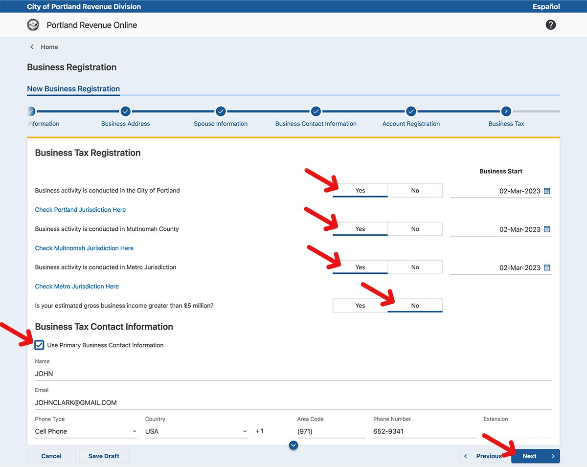 • For ‘Business Activity is conducted in the City of Portland’, click ‘YES’ and enter today’s date for Business Start