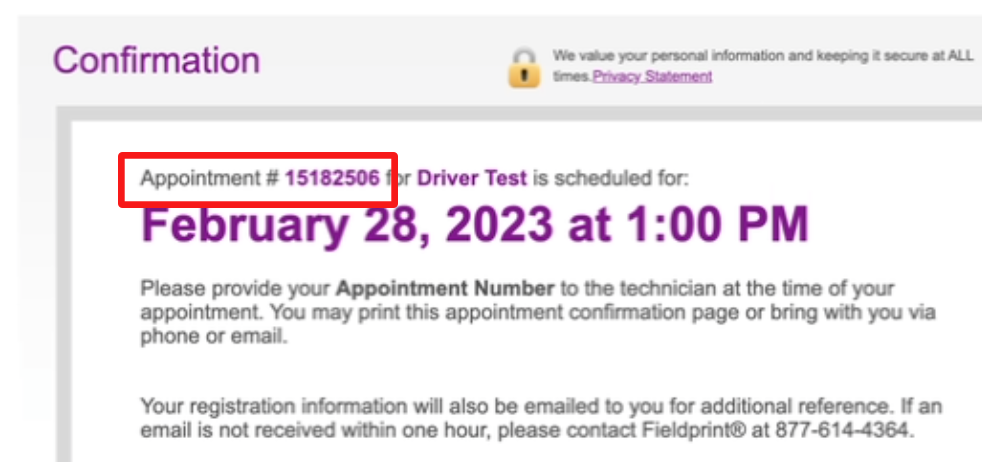 You’ll need to show this number when you arrive at your appointment. It can be found on the confirmation page and will be emailed to you by Fieldprint.