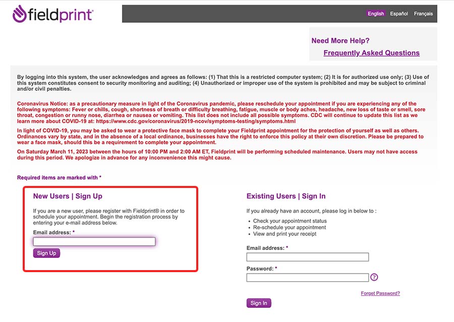 2. Enter your email address under the “New Users” section and click Sign Up.