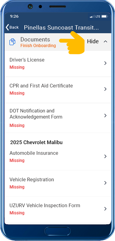 In the Drive app, navigate to the Documents tab for your transit program. Here’s what you’ll see. Tap on each document to upload it to the app.