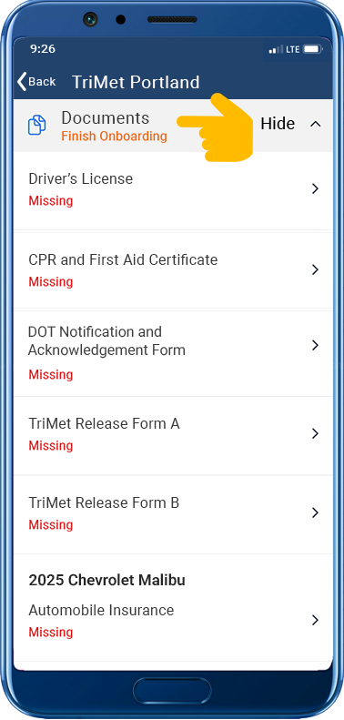 In the Drive app, navigate to the Documents tab for your transit program. Here’s what you’ll see. Tap on each document to upload it to the app.